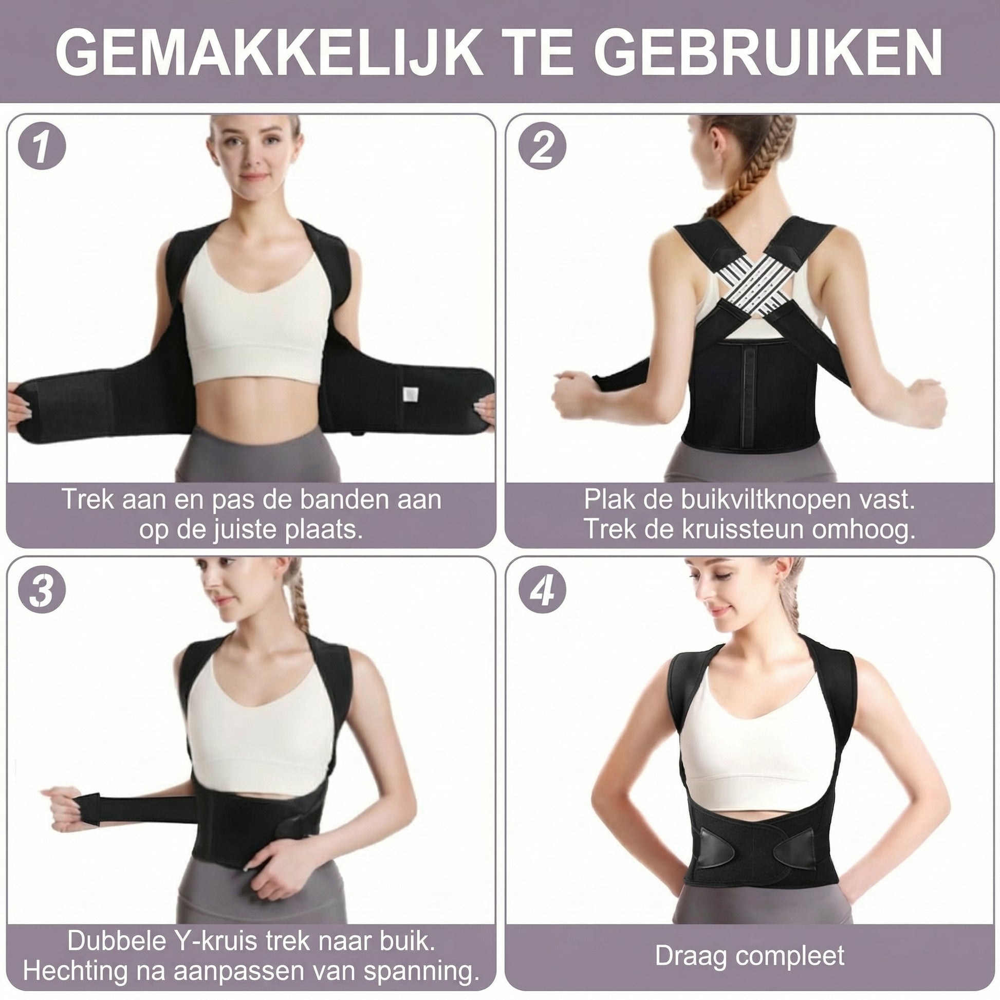 Het dragen is eenvoudig. Trek het aan en pas de schouderbanden aan voor een stevige, comfortabele pasvorm. Maak de klittenbandsluitingen bij de buik vast en trek vervolgens de dwarsbanden in een Y-vorm naar uw buik toe. Het brengt uw schouders en ruggengraat zachtjes opnieuw in lijn, waardoor uw lichaam wordt getraind om een natuurlijke, rechte houding aan te nemen. Begin met 15-30 minuten per dag en verleng de tijd naarmate uw houding sterker wordt.